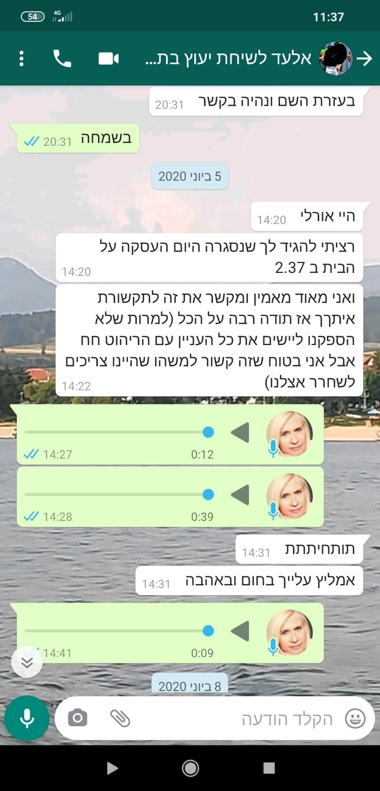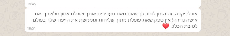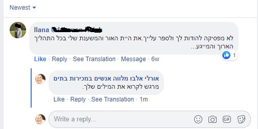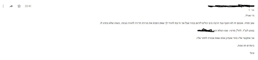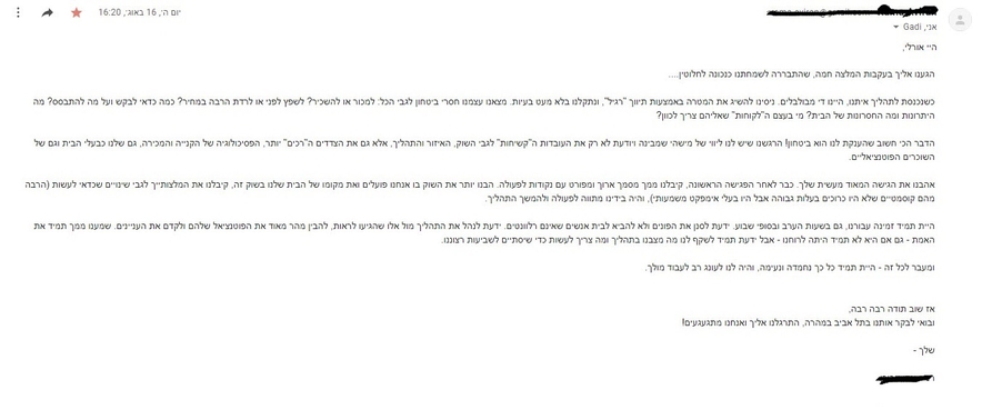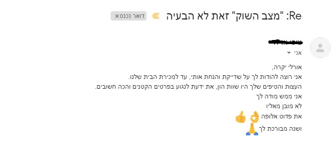 שוב תודה. אומנם זה לא הסוף ועוד הרבה מים יכולים לזרום בנהר אבל אני חייבת להגיד לך שאת הפכת את מכירת הדירה לחוויה נעימה, משהו שלא ציפינו לו.