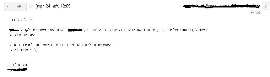 רציתי לעדכן אותך שלפני שבועיים מכרנו את המגרש בצפון בהרחבה של קיבוץ XXX ובאותו היום מצאנו בית לקניה בXXX